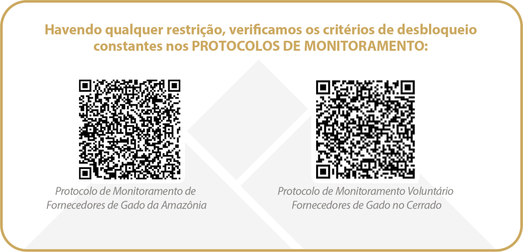 Em relação ao monitoramento de fornecedores indiretos, temos o compromisso de buscar um sistema de rastreabilidade e monitoramento que permita demonstrar, até dezembro de 2025, a não aquisição de gado associado ao desmatamento ilegal por fornecedores diretos e indiretos através do levantamento de dados públicos e informações de terceiros, de modo que possamos contribuir ativamente para a mitigação do desmatamento ilegal por fornecedores de nível 1 (aquele originado por fornecedores de nossos fornecedores diretos).